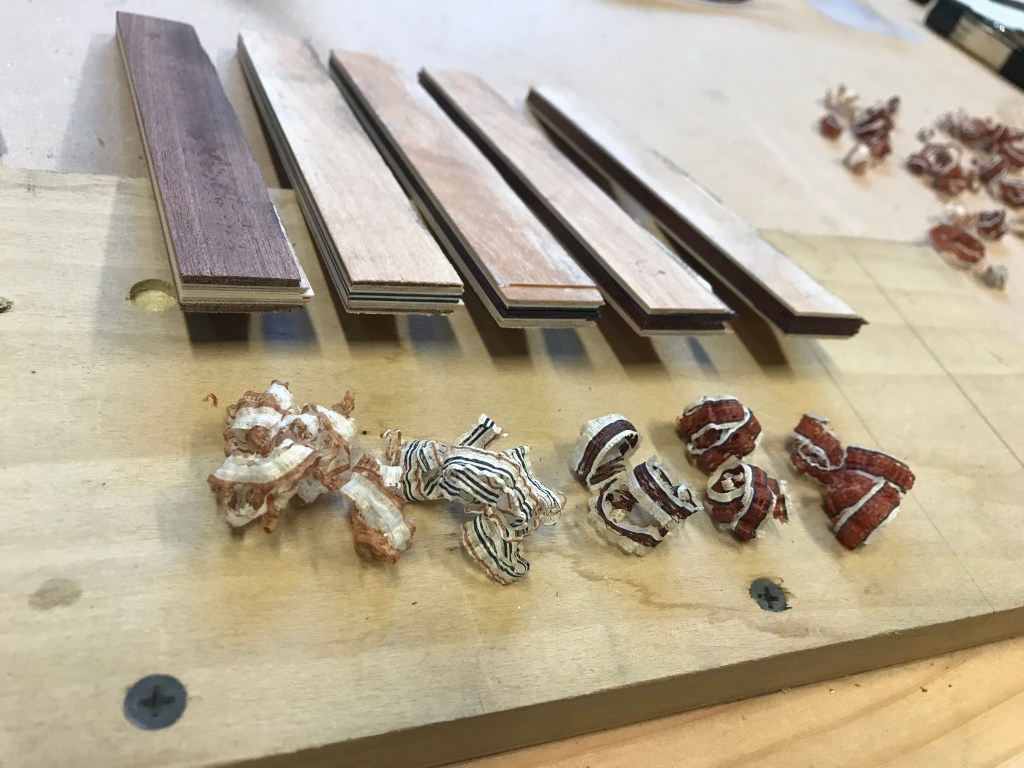 The idea for the Diamondback theme came from a peyote-stitch beaded ukulele strap I had made with a Diamondback Rattlesnake pattern. I used the same pattern for the backstrap and rosette for this instrument, along with a rattlesnake-shaped peghead, plus rattle and snake tongue accents. The rosette and backstrap were inlaid with tiles I made in the tradition of classical guitar rosette construction, built up from 5 stacks of different wood veneers, layered in different orders. The stacks were then sliced vertically and recombined to create the snakeskin pattern in cross section. The fret markers are slices of copper tubing inset with tiles from the rosette project.