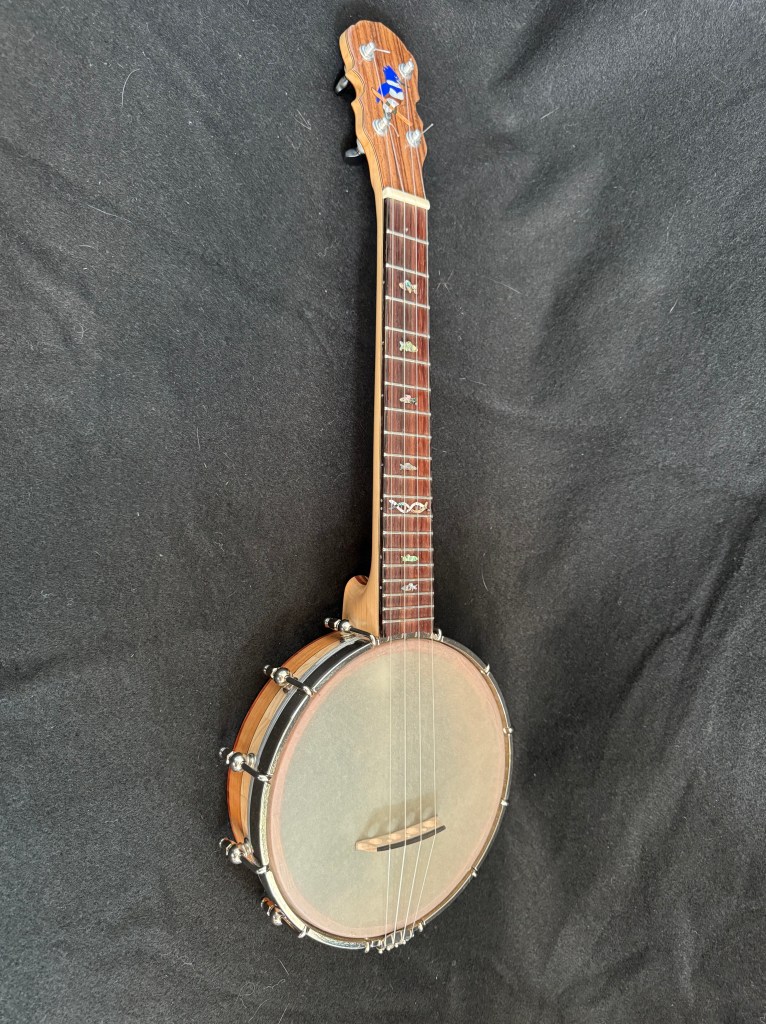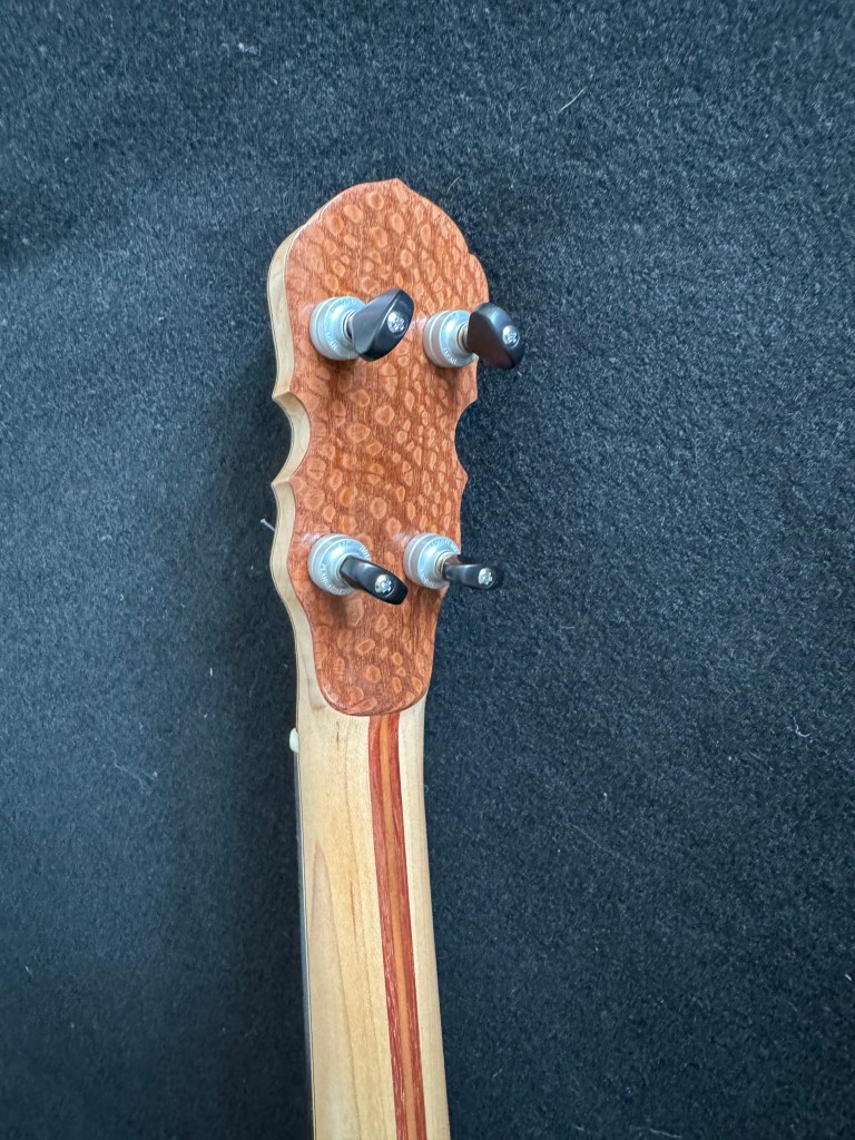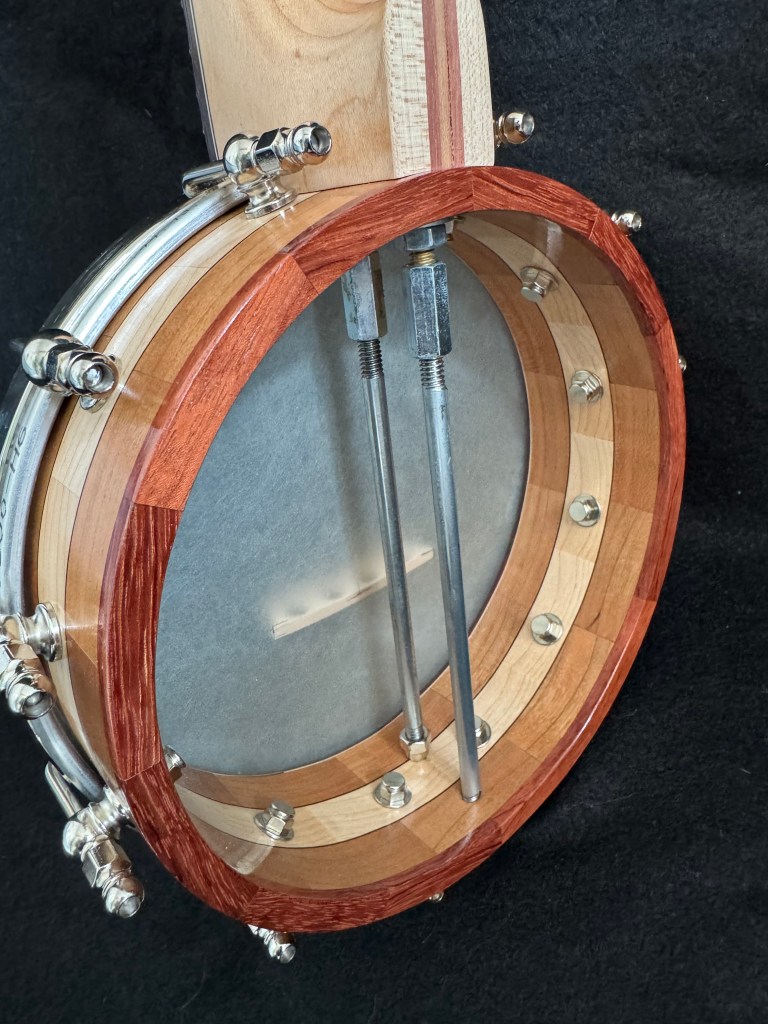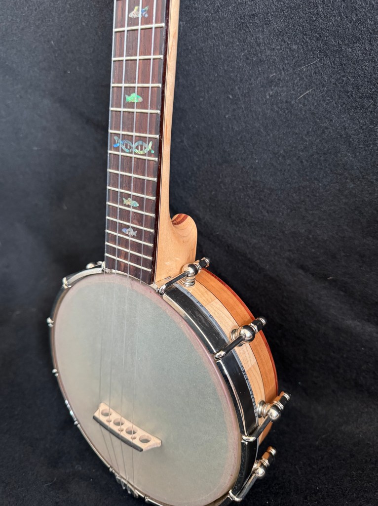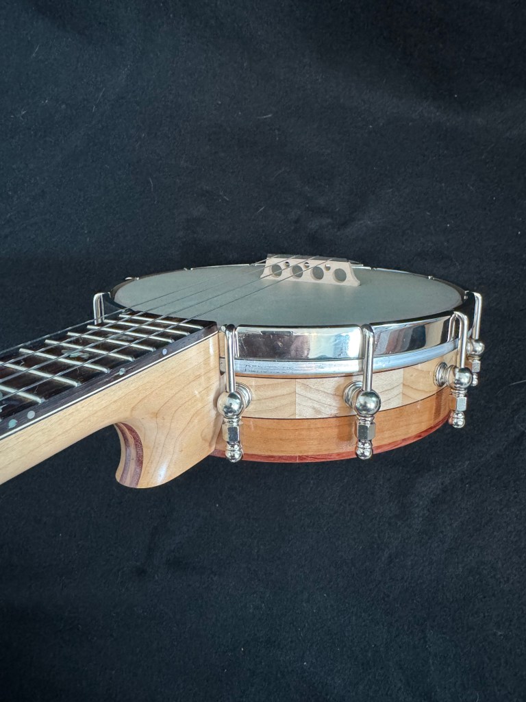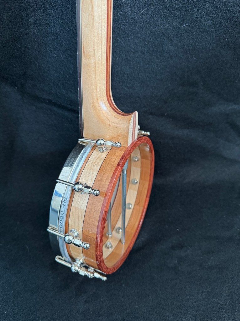 The rim is built of several layers of segmented cherry and maple, with bubinga accents. The maple neck is also laminated with cherry and bubinga. It has a 17 inch tenor scale . The curved bridge I built works well with the high G tuning.
