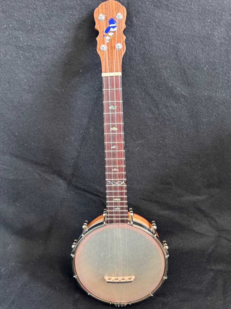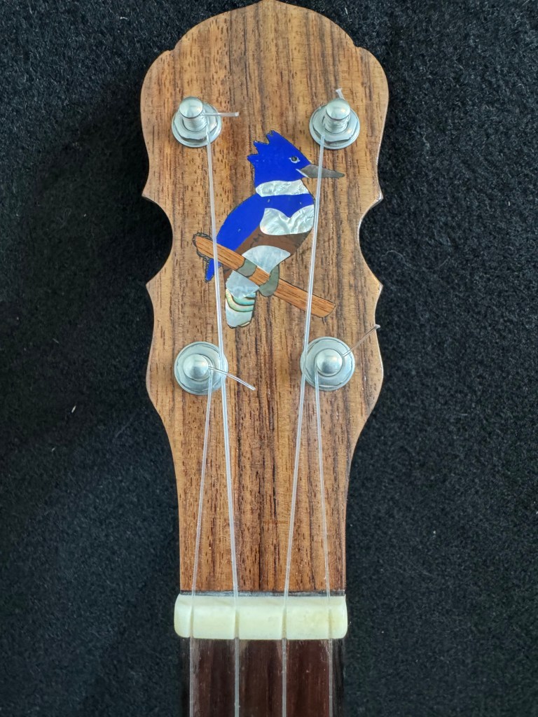 I decided to build a banjo uke for myself, and gave it a Kingfisher theme. The shell and recon stone peghead inlay of the Kingfisher is hunting the little abalone fish fret markers.