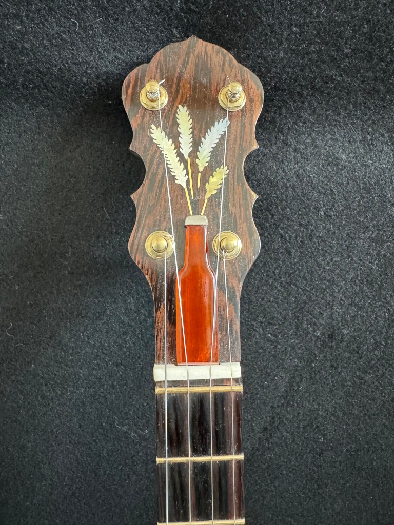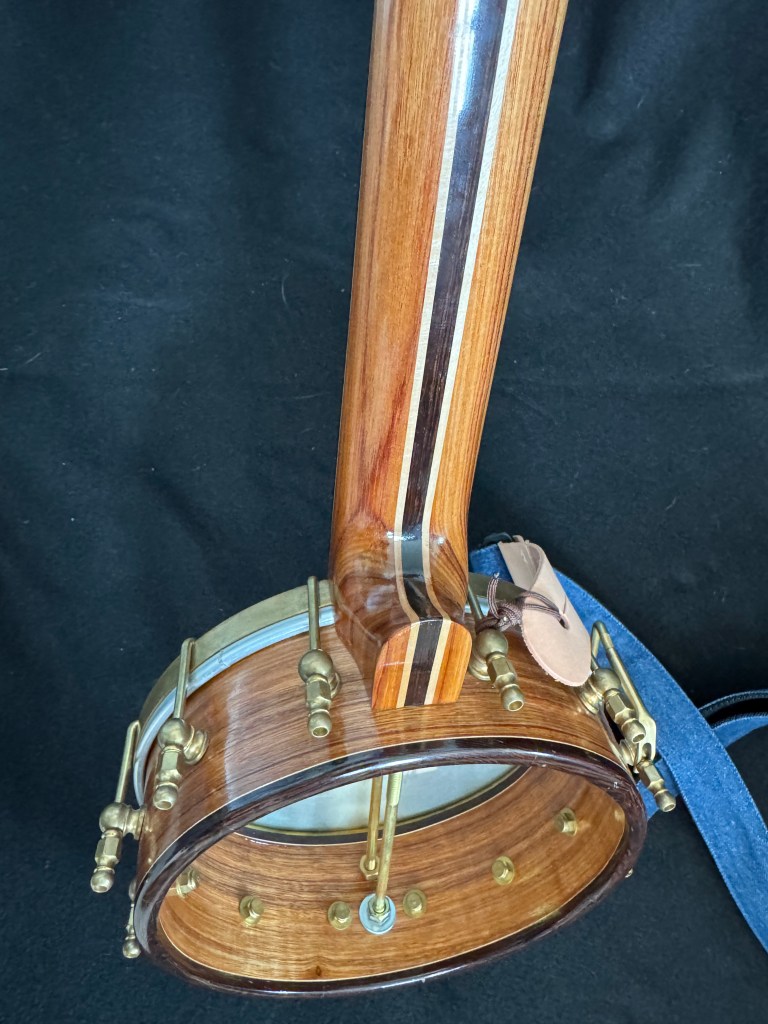 Playing a 22 lb. Banjo can be hard on your back, so I wanted to try building a real, bluegrass banjo with an 8 inch banjolele-sized rim. It has a 20 inch scale fretboard, and I am still experimenting with different strings so I can use the standard open G tuning that I am most used to.