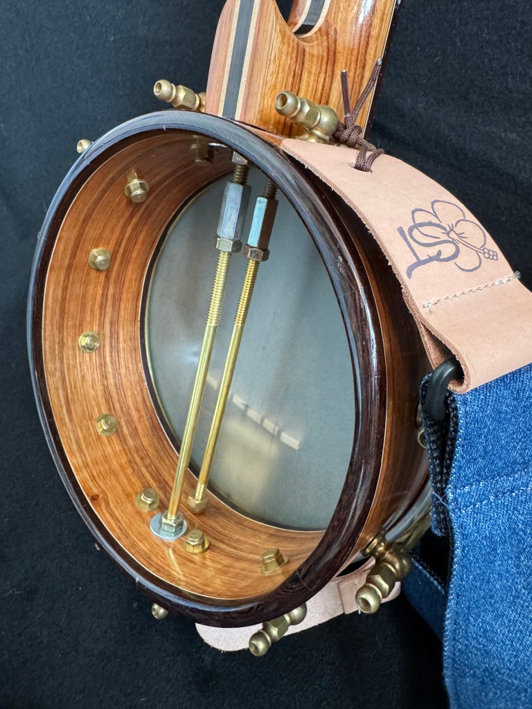 The rim is constructed from layers of steam-bent Canarywood, with Wenge accents. The neck is also Canarywood and Wenge, and has an adjustable truss rod. I could not find an 8 inch tone ring, so I built a jig to bend a length of 1/4 inch brass rod into a circle. Then I brazed it closed, and mounted it on the rim, instead of using just the wooden rim, like my banjoleles.