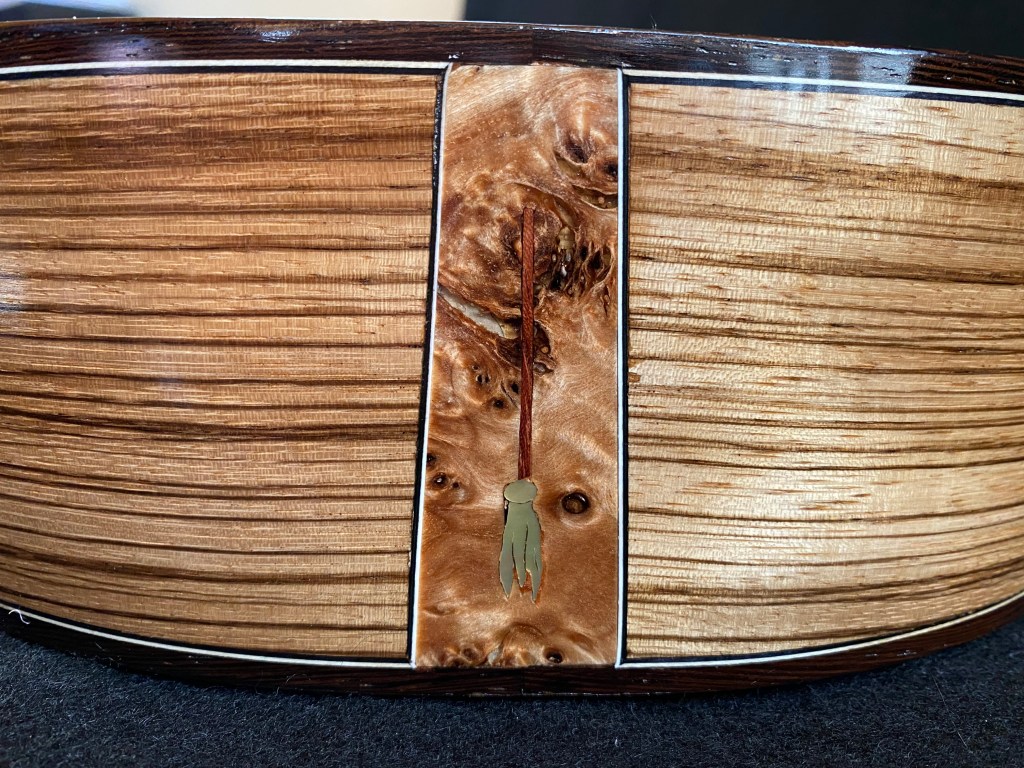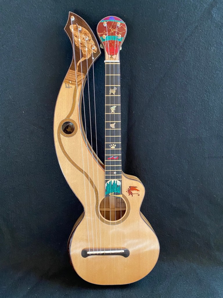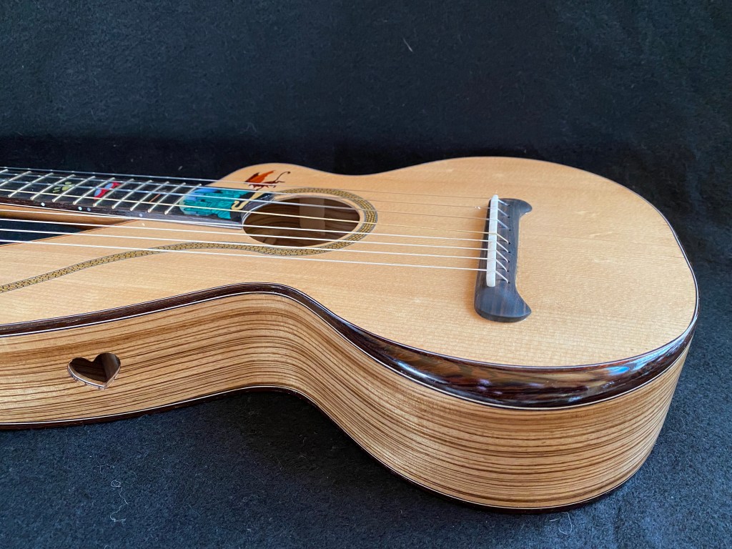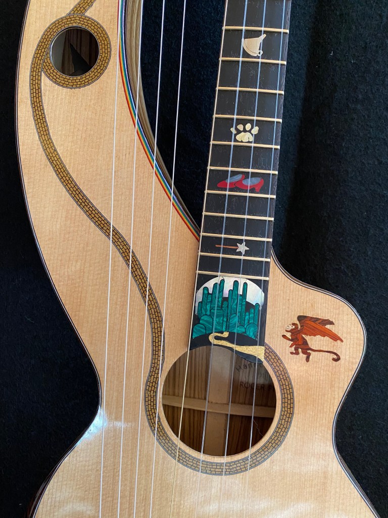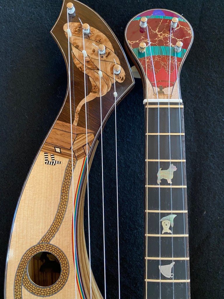 My passion for customizing instruments with a theme came to a head in this project. I first wanted to make a rainbow purfling of colored veneers to bind the inside curve of the harp arm, and that idea eventually led to the Wizard of Oz in all its glory. From the cyclone on the harp head dropping the house on the Wicked Witch of the East, along the Yellow Brick Road to the Emerald City, you can follow the story of Dorothy and her companions up the fretboard to the Wizard in his balloon. The Wicked Witch of the West herself is hiding in the harp arm sound hole with her crystal ball. The Tin Man’s heart soundport, flying monkey, and the witch’s broomstick on the end wedge round out the cast. I think the beauty of the Zebrawood compliments the inlays nicely.