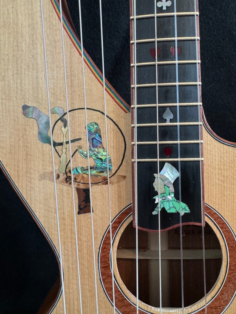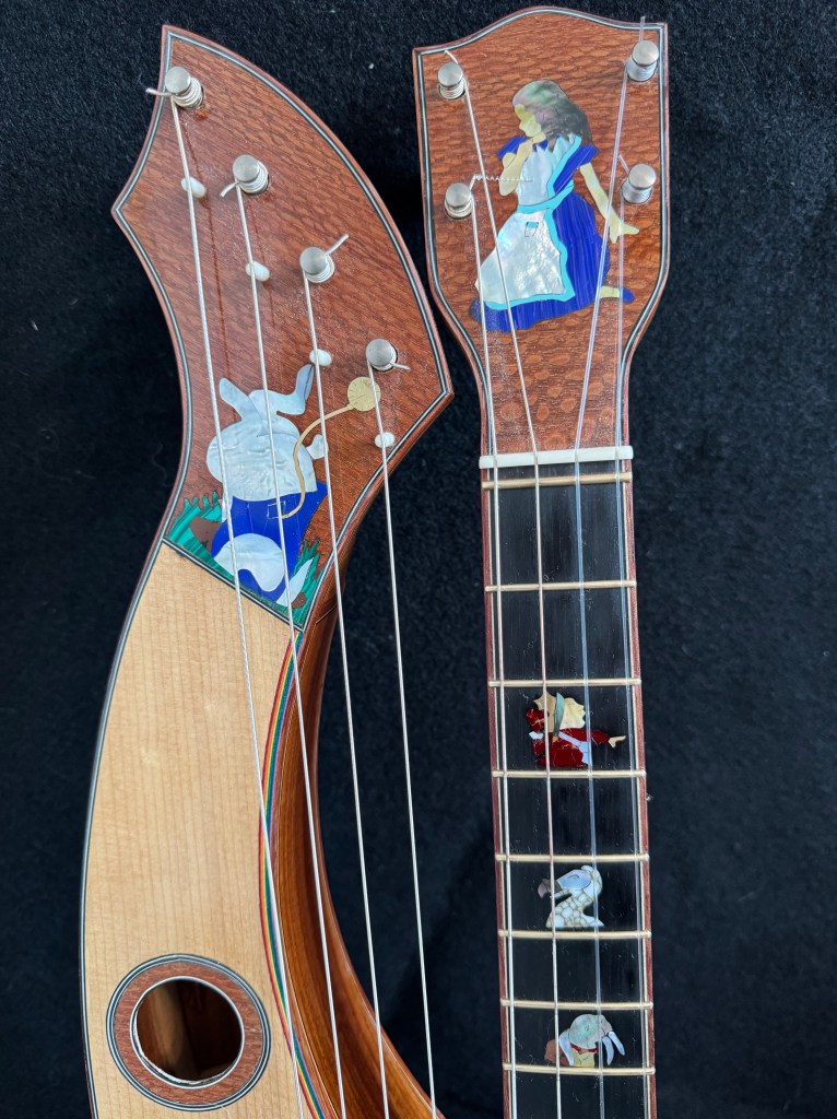 Alice in Wonderland seemed a fitting compliment to the Wizard of Oz theme of the tenor, and has some of my favorite inlays thus far. Alice and the White Rabbit adorn the pegheads, with the Hookah Smoking Caterpillar on the upper bout. The Red Queen, Walrus, Dodo, Mad Hatter and card suits mark the frets, while the Cheshire Cat hides in the harp arm soundhole.