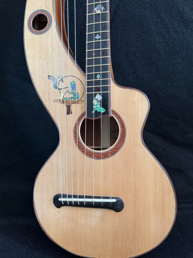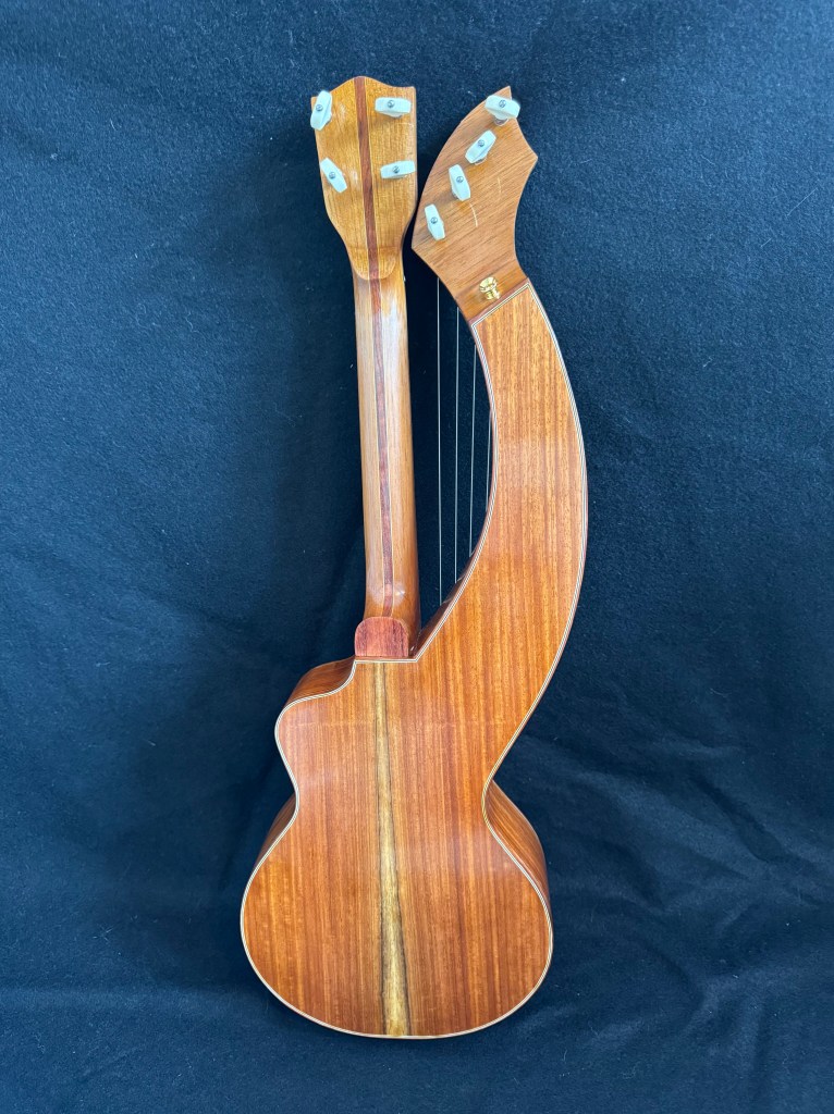 This companion piece to the Oz tenor is exactly the same size and shape, but has heavier gauge strings to enable standard DGBE baritone tuning. The harp strings are also tuned correspondingly lower. It has a very mellow, rich sound with even more sustain than the Oz tenor. It lends itself well to many of the classical pieces I play. As I most often tune it, it has a slightly wider range than a guitar. The K&K Pure Classical 4-spot pickup maintains a nice acoustic sound when plugged in.