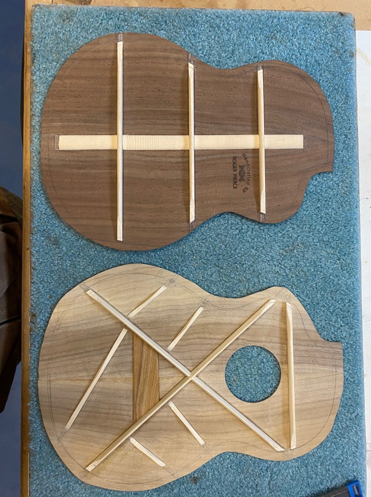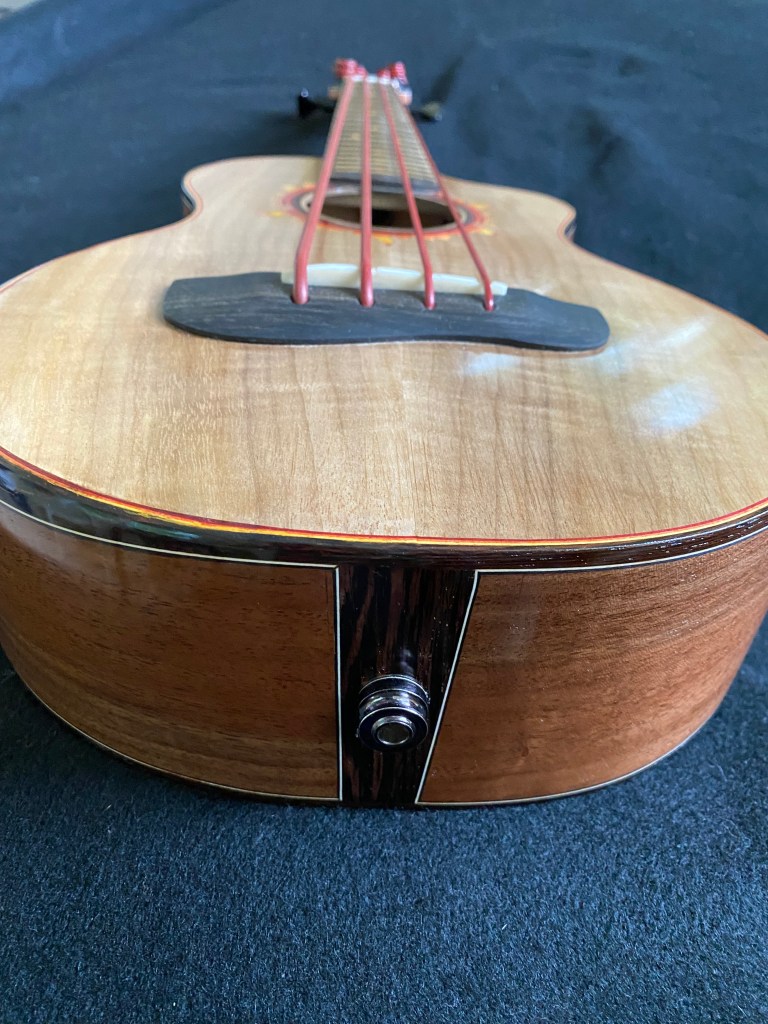 My nephew Ryan commissioned this ukulele, and gave me free license to design. It. I had been wanting to build an instrument out of some Black Walnut I had. It was salvaged from a tree next to Katherine’s cousin’s home in Paradise CA, which had been destroyed in the Camp Fire. My first design idea was a campfire with s’mores on the peghead, but I ended up with this flame rosette. I constructed it from colored veneers laminated around a section of PVC pipe, then ripped into thin inlay material. I made the tricolor purfling to match. Built using my Baritone forms, the top is X-braced. It is meant to be amplified with the K&K Pure Bass pickup I installed, but it has a nice sound acoustically, although quiet.